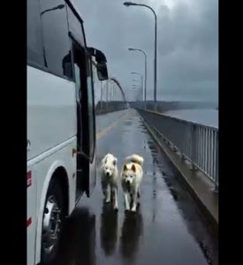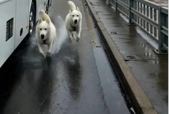 On a gloomy, overcast day, a bus was making its way across a long bridge when two large, white dogs suddenly appeared in its path. The driver, forced to stop, watched as the dogs began frantically barking and jumping up against the front of the vehicle. It was clear from their behavior that something was terribly wrong, and their persistence convinced the driver to open the doors.