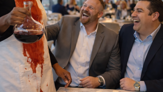 While she was pouring wine, one of the men suddenly bumped her arm. The red wine spilled, staining her apron and splashing across the table. Instead of apologizing, the two men laughed. The moment felt humiliating. She tried to stay composed, but the embarrassment was clear on her face.