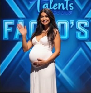 The stage was quiet, glowing with expectation. Then, from the shadows, she appeared—draped in a flowing white gown that moved like water, her hands resting gently on a full, rounded belly. The lights caught her smile first—warm, steady, and radiant with the kind of beauty that can only come from deep within. She wasn’t just stepping into the spotlight. She was carrying it with her.