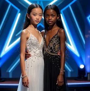 The lights dimmed, and a hush fell over the theater. From the glowing stage of America’s Got Talent, two young girls stepped forward hand in hand. One wore a white gown that sparkled under the lights, the other a black gown shimmering with golden threads. Together, they looked like living symbols of balance—two halves of a whole, carrying within them a message much larger than themselves.
