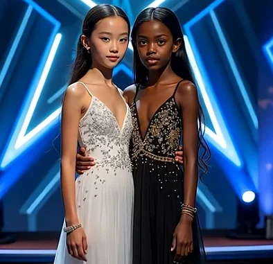 The lights dimmed, and a hush fell over the theater. From the glowing stage of America’s Got Talent, two young girls stepped forward hand in hand. One wore a white gown that sparkled under the lights, the other a black gown shimmering with golden threads. Together, they looked like living symbols of balance—two halves of a whole, carrying within them a message much larger than themselves.