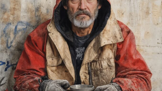 Vadim decided to step out for some fresh air. He turned on the alarm and walked around the church. Then he saw a bench where a man in dirty clothes was sitting on the ground. He wore a long coat, from under which his legs in dirty summer sneakers, once white, could be seen. His hands were dirty, his face covered with a beard, and he wore a black knitted cap. Judging by his appearance, he was homeless. Next to him was a small cart with some rags and apparently a blanket on it. In his hand, the man held a plastic cup into which people threw alms.