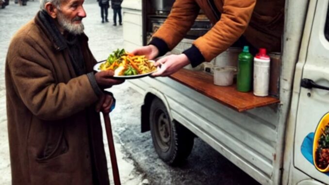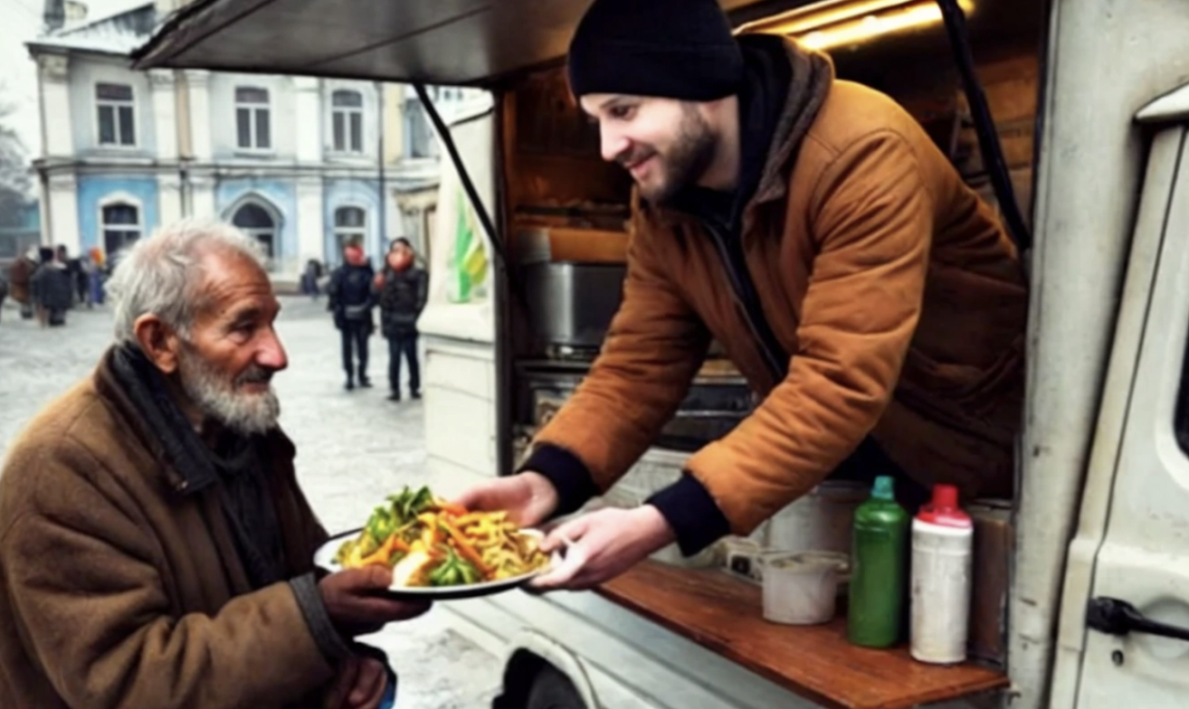 A minute later, Mikhail came out of the van with two plates of hot soup. He carefully placed them in front of the couple and smiled gently.
