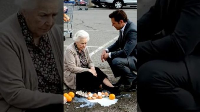 Nearby, a man in a business suit observes the interaction. Concerned, he approaches the elderly woman. Kneeling beside her, he helps gather groceries that have fallen and reassures her gently, telling her she has done nothing wrong.