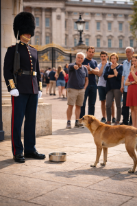 From the far side of the courtyard, a thin stray dog slowly walked across the stones. His fur was dusty. His body lean. Each step careful, tired. In his mouth, he carried something unusual — an empty metal bowl.