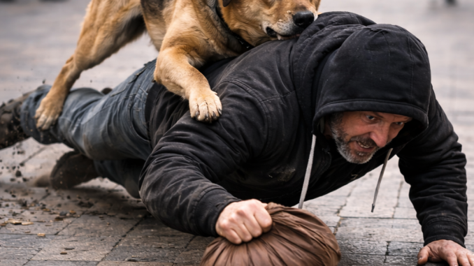 On the sidewalk nearby sat a poor man in worn clothes, his jacket old and dusty, his beard rough from days without care. Beside him was his only companion — a loyal dog with alert eyes and a protective heart.