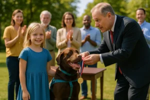 Judge Dawson had contacted the mayor personally. Moose was officially awarded the Medal of Loyalty and Bravery, the first of its kind for a service dog in our town.
