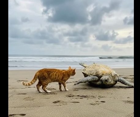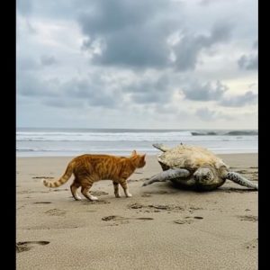 Lying helpless on the sand was a stranded sea turtle, flipped onto its back and unable to move. The cat approached first, gently circling the turtle — realizing it couldn’t help alone.