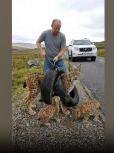 A compassionate man driving along a quiet rural road made an unexpected and brave decision when he spotted a wild lynx mother in desperate need. Her head was trapped inside a discarded tire, and her two tiny cubs stood helplessly beside her, unsure of what to do. Exhausted and frightened, the mother lynx struggled to break free — but the thick rubber held her firmly.